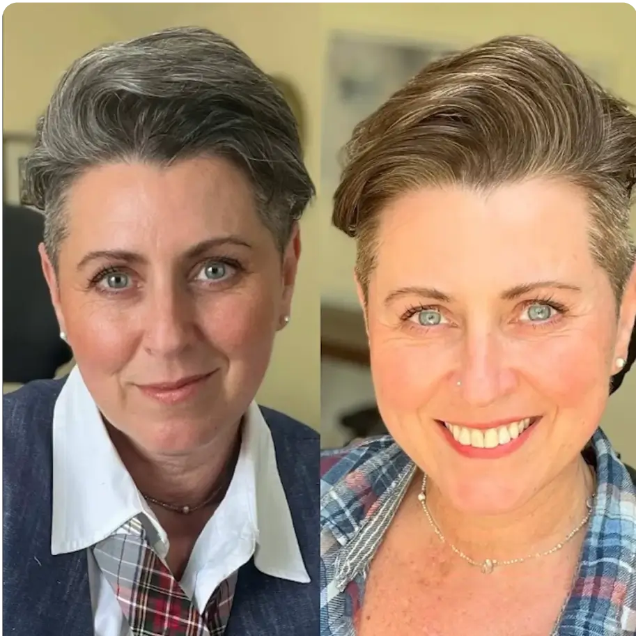 Pérennité : teinte naturelle et uniforme, tenue jusqu'à 6 semaines. Couvre parfaitement les cheveux blancs pour un look toujours net